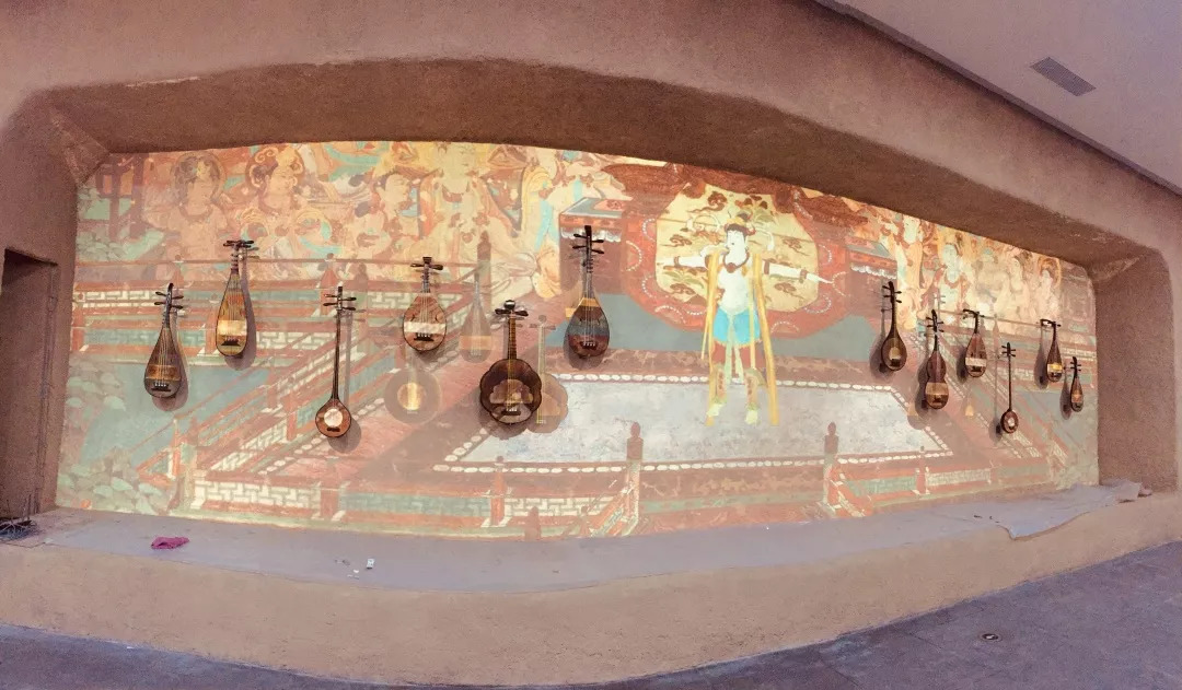 踏進(jìn)“敦煌樂舞”按照敦煌壁畫原景高度還原的影像投射墻步入眼簾,敦煌特色民族樂器被錯落有致地安排在了墻面兩邊,飛天神女做反彈琵琶的身形,其神態(tài)雍容、身姿綽約地穿梭與樂器中,兩者虛實相合、相互映襯。