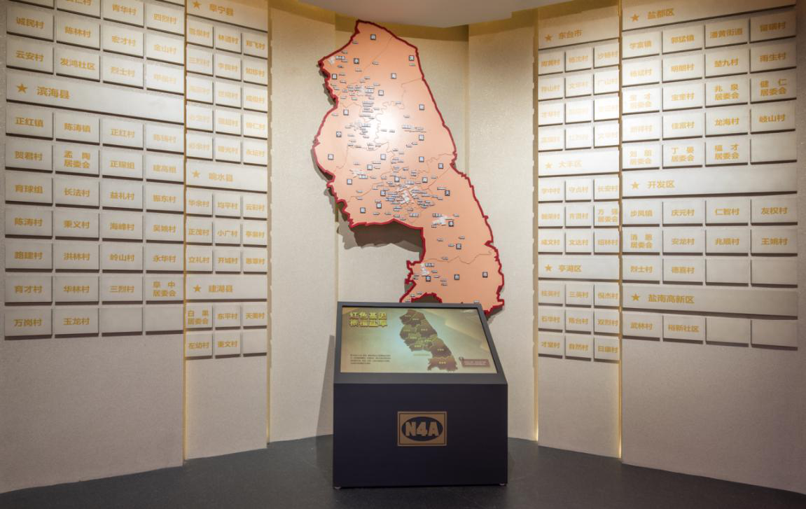 鹽城新四軍紀念館是全國唯一的專業(yè)性新四軍紀念館。醒目的藍白相間的“N4A”臂章圖案,鑲嵌在展廳正門上方,兩側旗形的花崗石陰雕畫,藝術地再現了新四軍與八路軍在白駒獅子口勝利會師和皖南事變后新四軍在鹽城重建軍部的歷史場面。