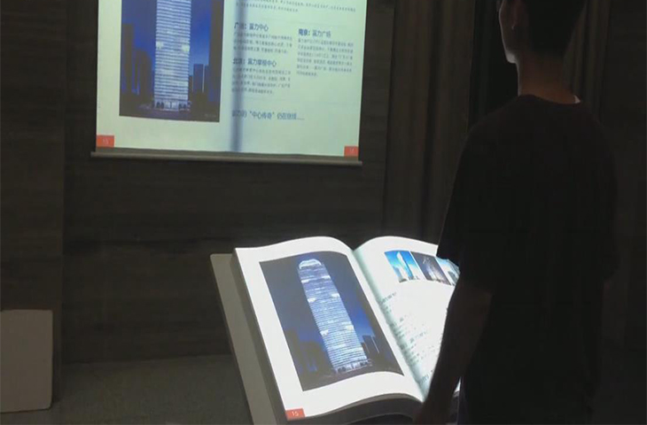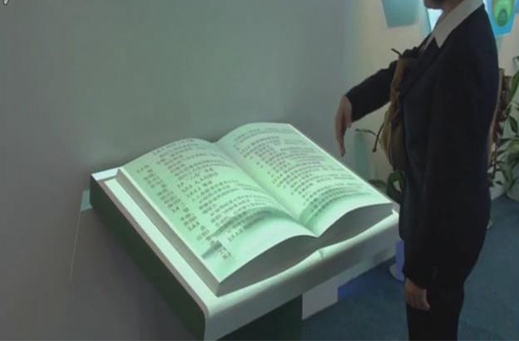 電子翻書:主要是由電子設(shè)備和投影技術(shù)組成,它不同于空中翻書是飄在空中的,是有實(shí)體的書模型,上面是投影機(jī)投射下的內(nèi)容,人在做出翻書動(dòng)作的同時(shí)也會(huì)發(fā)生脆脆的聲響,就像正在看普通書籍樣。