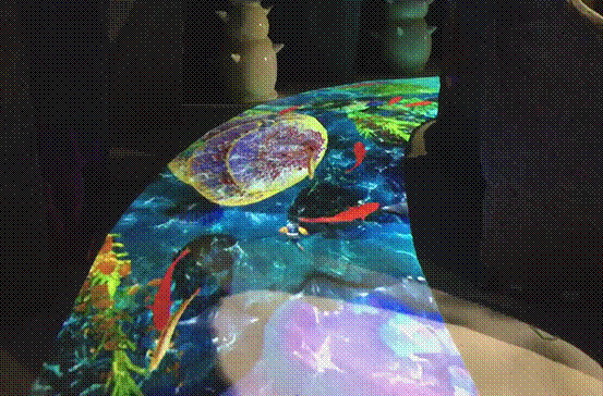 地面互動是參與者和地面上影像的真實互動,使多名參與者融入場景中,同時參與游戲。當你踏入投影機投射在地面上的影像時,你可以直接使用雙腳在地面投影幕上的虛擬場景進行互動,然而互動效果就會隨著你的腳步產生相應的變化。