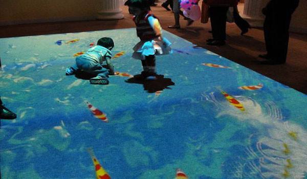 1、互動魚池:水池是投影畫面,顯示出的影像是魚在水中游動,當人們從投影區域內走過時,水面會出現水波紋的 效果,而且魚兒也會及時的避開。